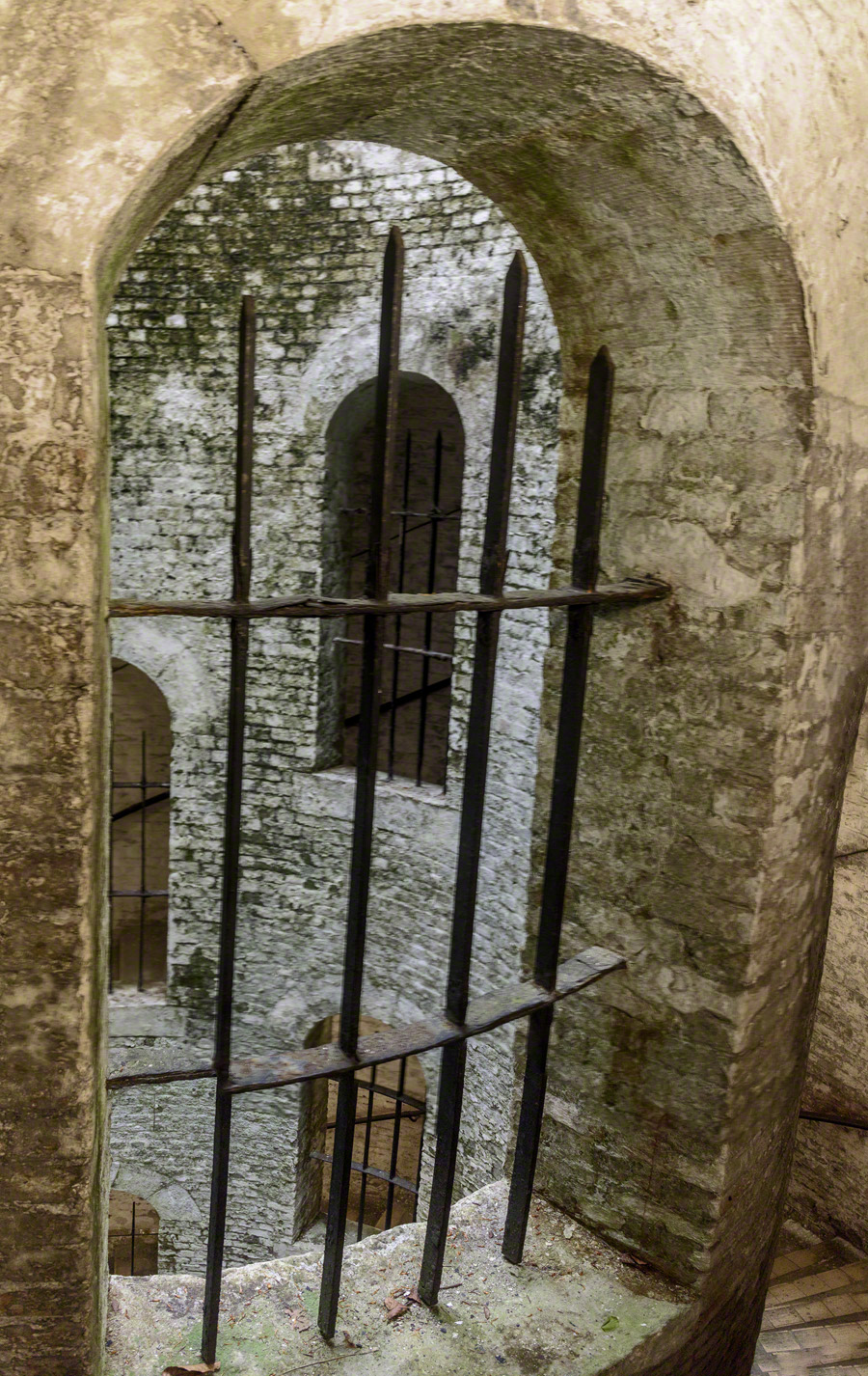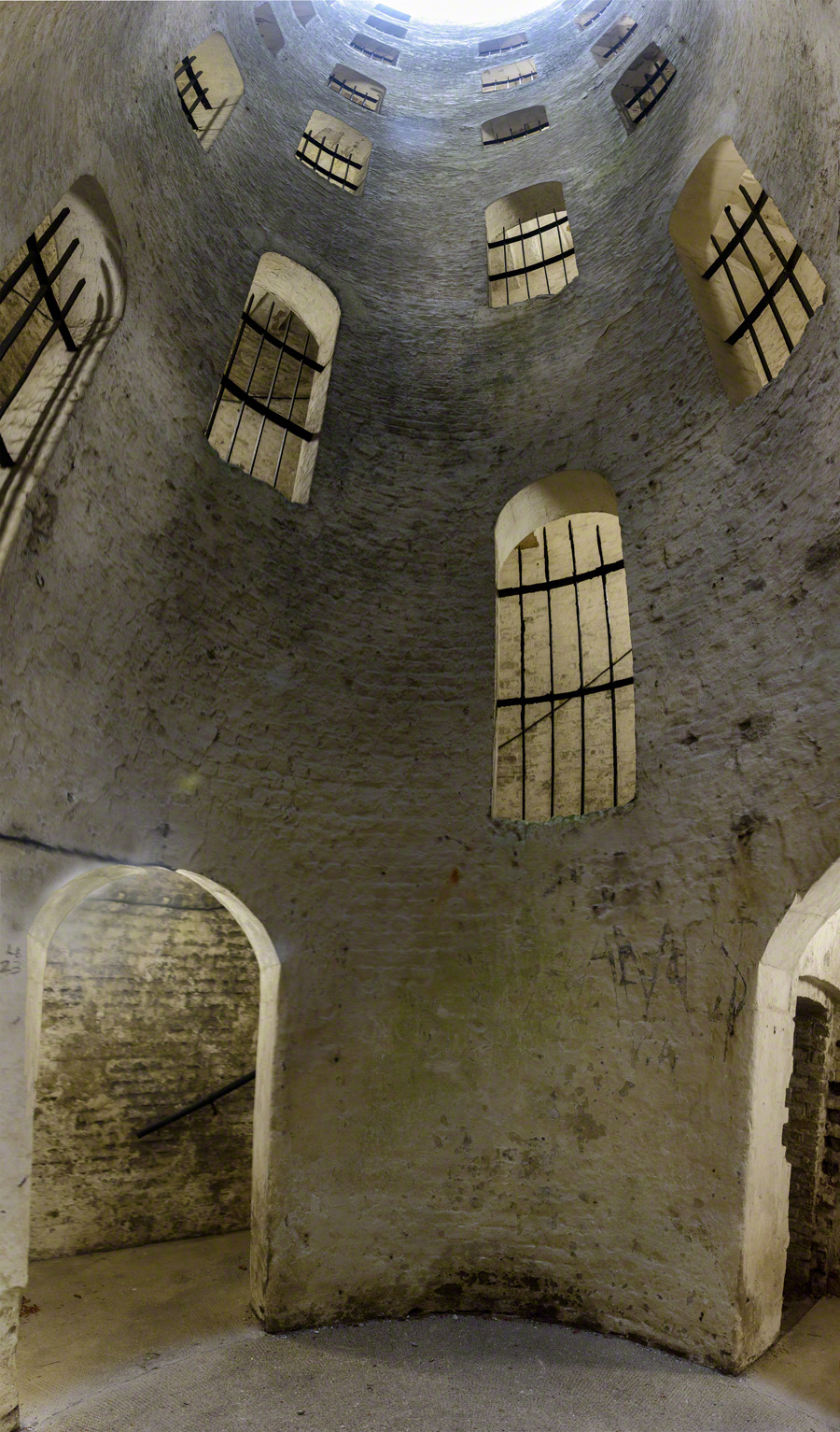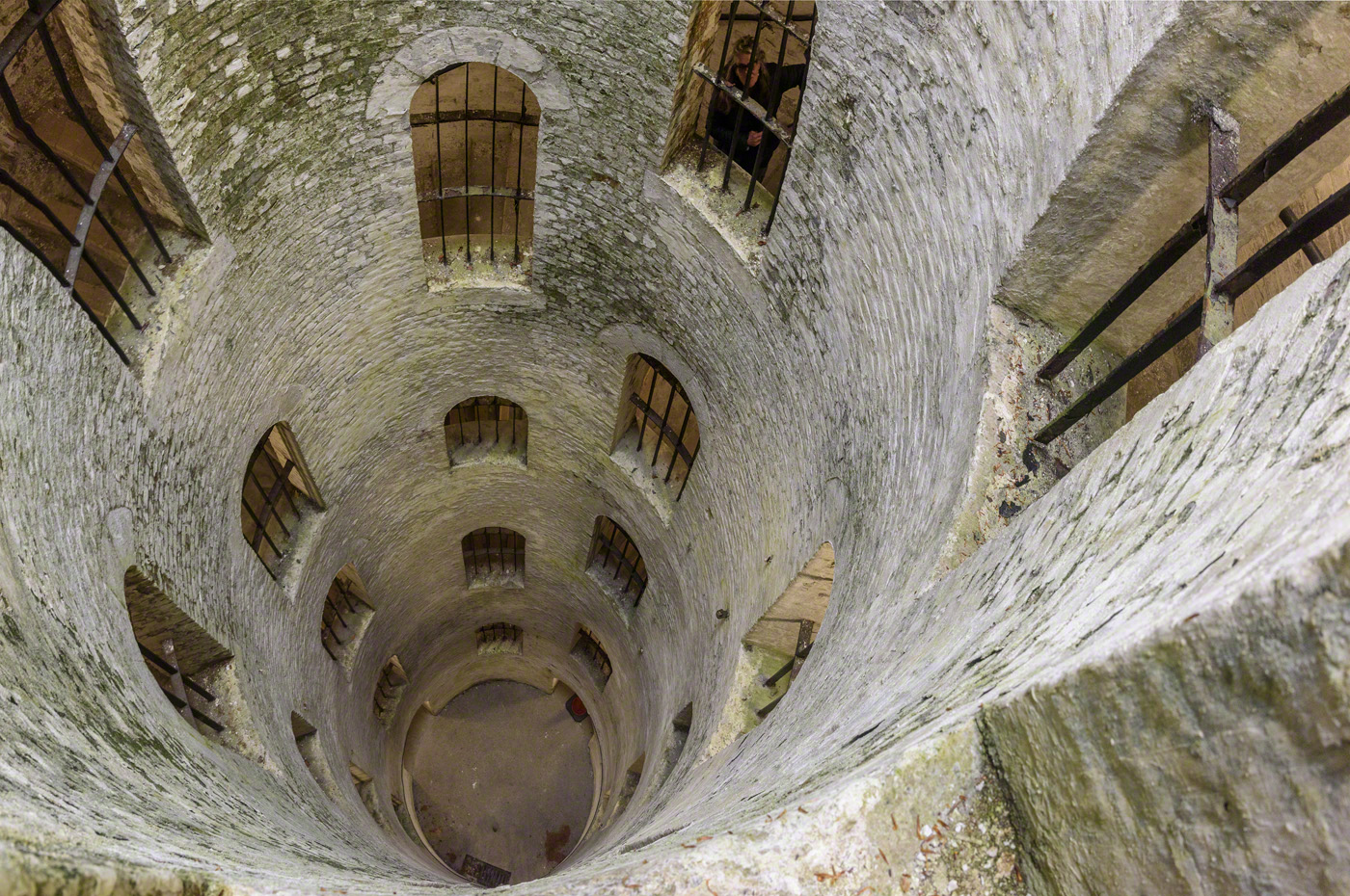 The shaft is 140 feet deep and 26 feet in diameter. The three staircases built of Purbeck Limestone wind clockwise one above the other. In the centre is a light and ventilation shaft which is open at the top and has windows in the sides for the stairways. There are 200 steps altogether separated by several landings. At the bottom the three stairways meet up in a sloping corridor that leads to the Snargate Street entrance.