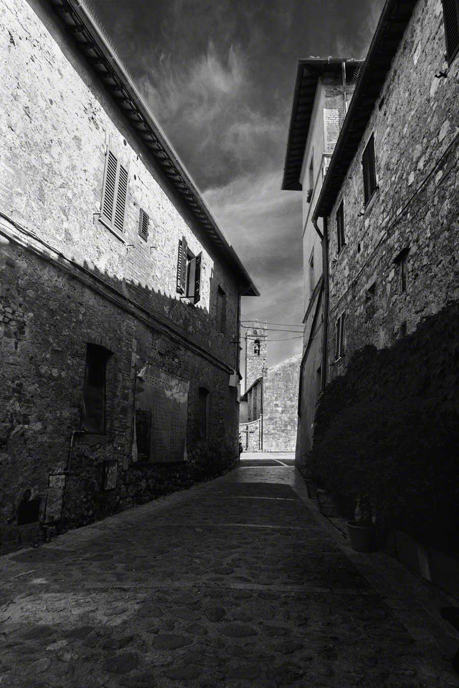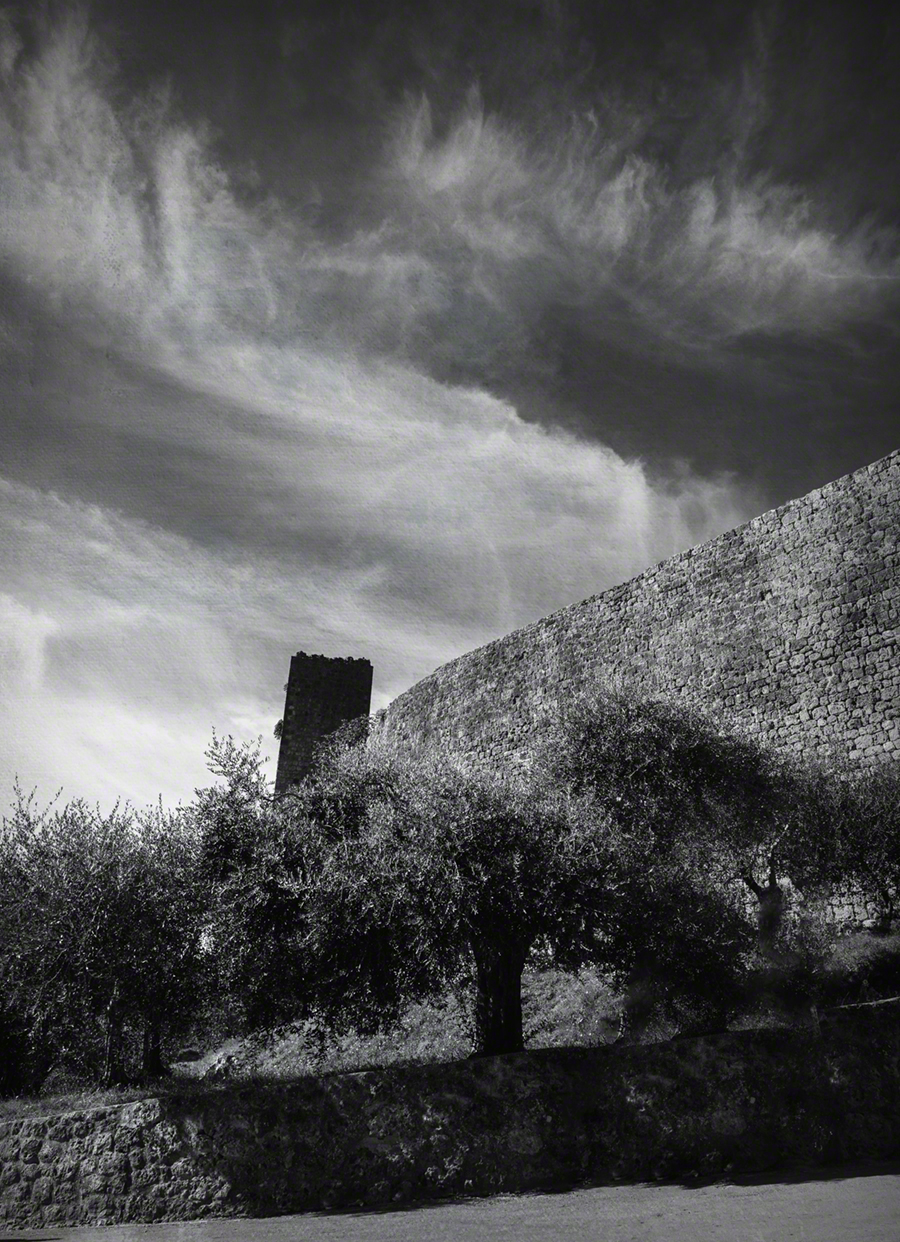 The roughly circular walls, totalling a length of about 570 metres (1,870 ft) and following the natural contours of the hill, were built between 1213 and 1219. There are 14 towers on square bases set at equidistance, and two portals or gates. One gate, the Porta Fiorentina opens toward Florence to the north, and the other, the Porta Romana, faces Rome to the south. The main street within the walls connects the two gates in a roughly straight line.